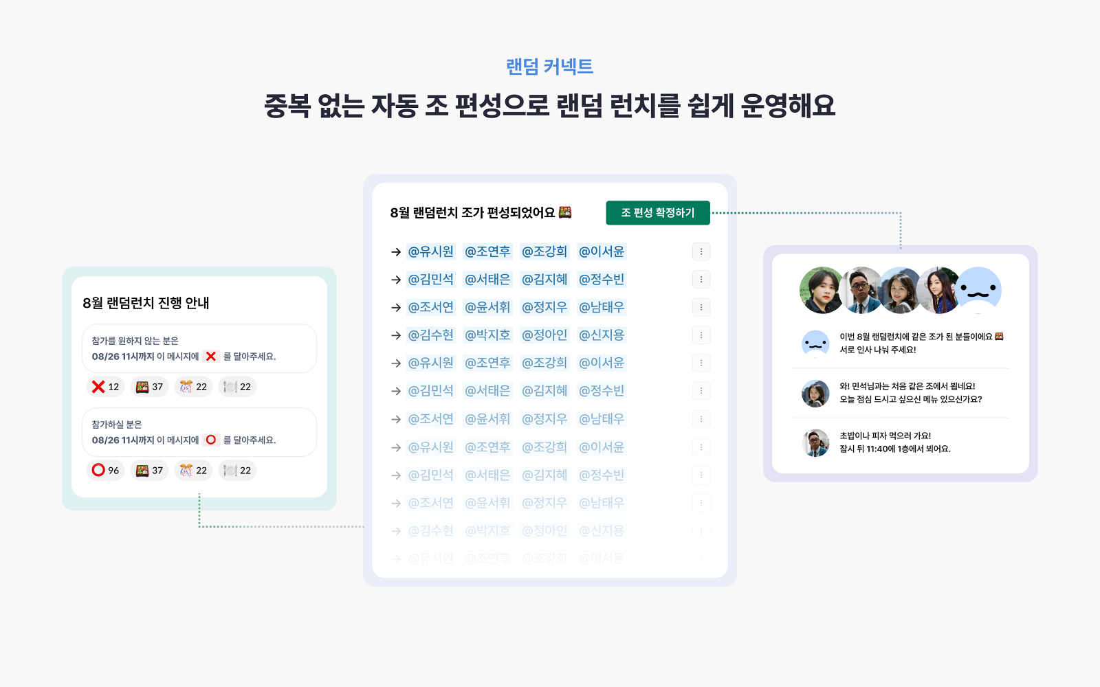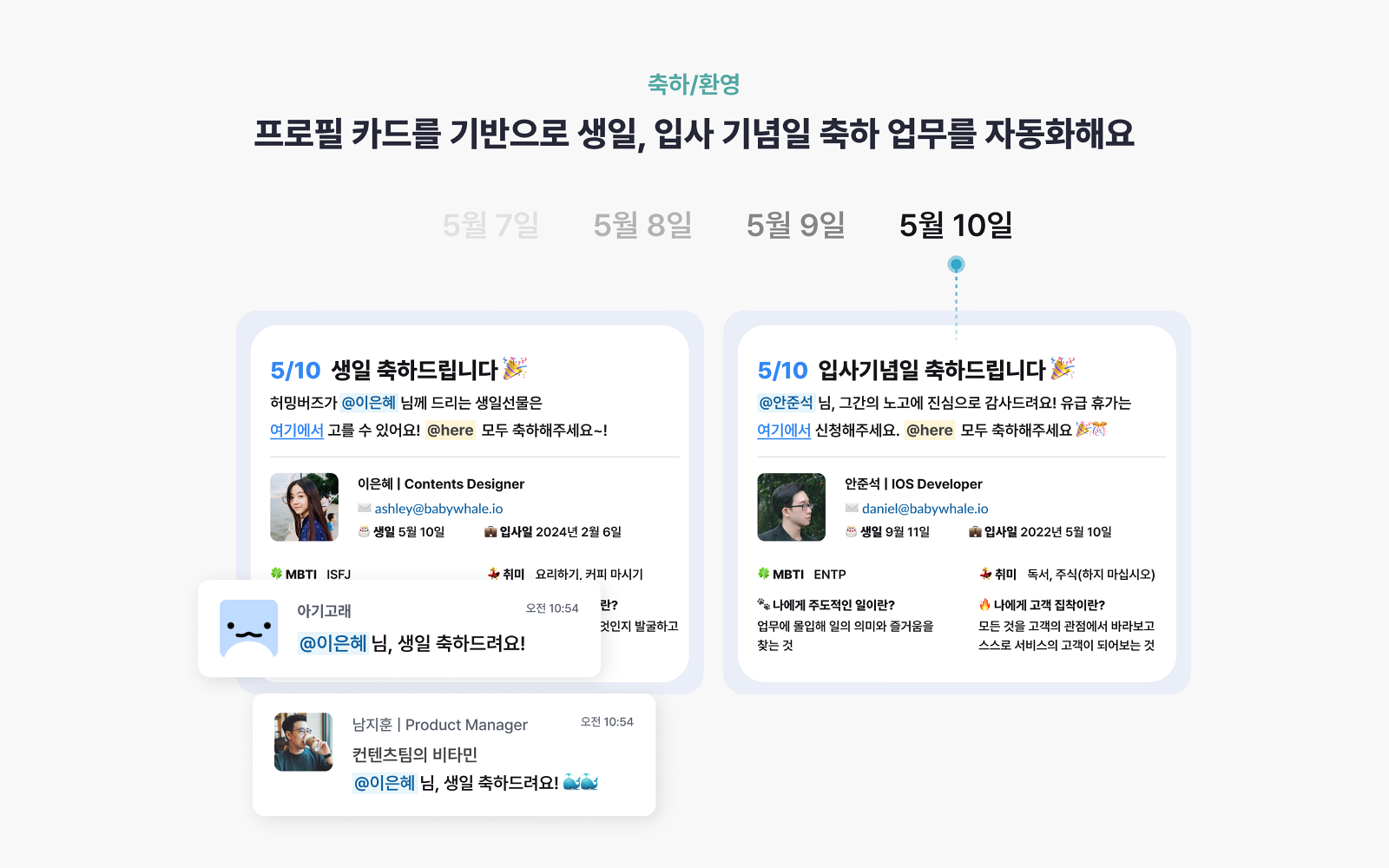 - 프로필 카드 정보를 기반으로 생일과 입사일을 축하해 주고, 신규 구성원이 입사해 카드를 완성하면 환영(소개) 메시지를 발송해 줘요.