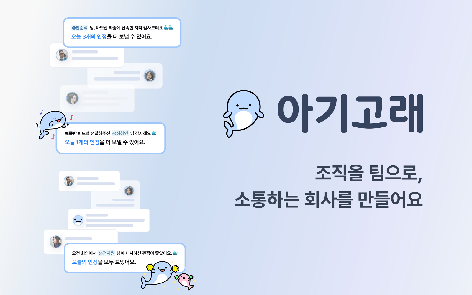 관리자 기능 3줄 소개개인이 용기를 얻어 조직에 몰입하고 구성원들이 하나가 되어 움직이는 회사는 *소통*하는 조직문화에서 출발해요.사내 구성원들이 서로의 존재를 온전히 믿고, 인정하고, 응원할 수 있도록 하는 방법과 관련해 함께 고민하고 싶다면, 아기고래 팀에게 연락해 주세요! 커피 마시면서 이야기 나눠요. 아기고래 팀은 사내 인정 문화를 잘 정착시킨 팀들의 사례를 많이 가지고 있답니다.아기고래와 관련된 문의 사항이 있다면, 언제나 편하게 연락 주세요!