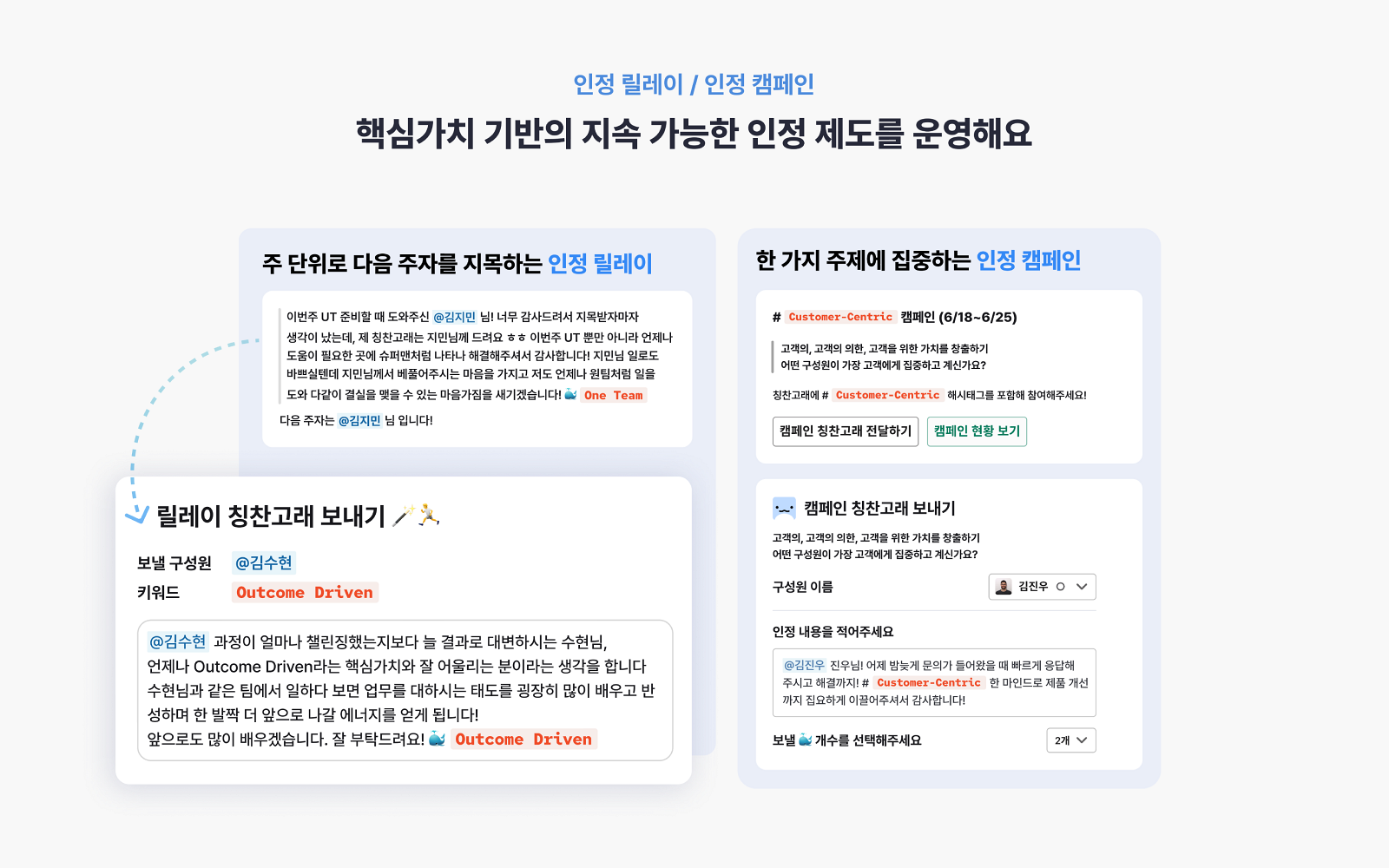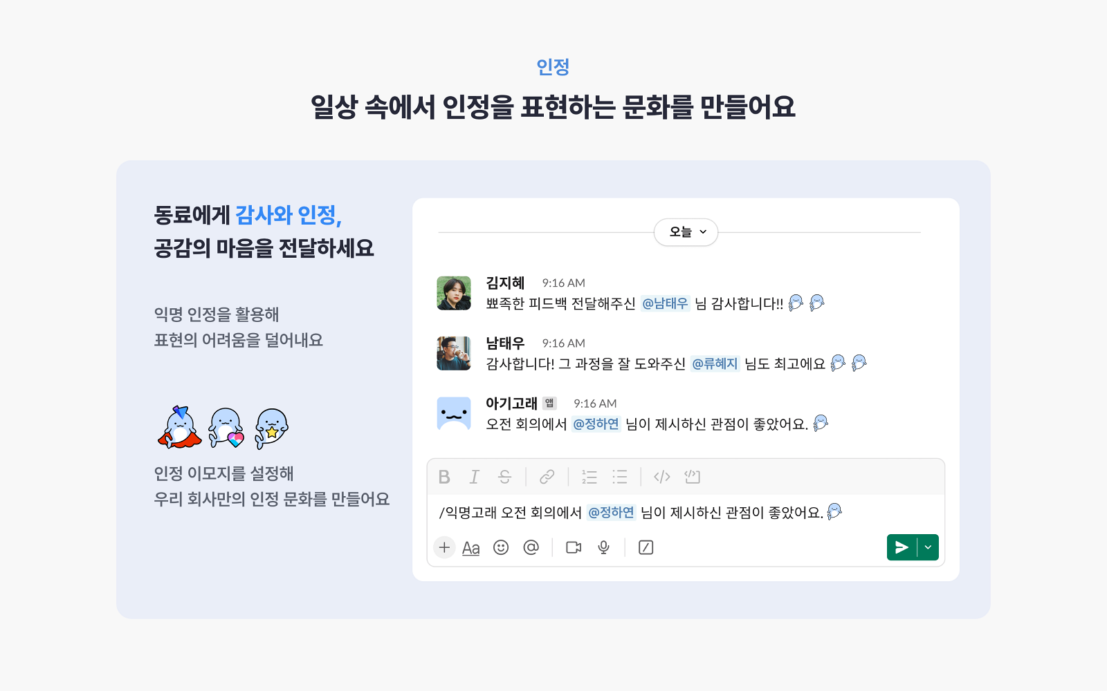 - 인정은 Slack 채널에서 메시지를 기반으로 인정 문화를 만들 수 있도록 돕는 기능입니다.