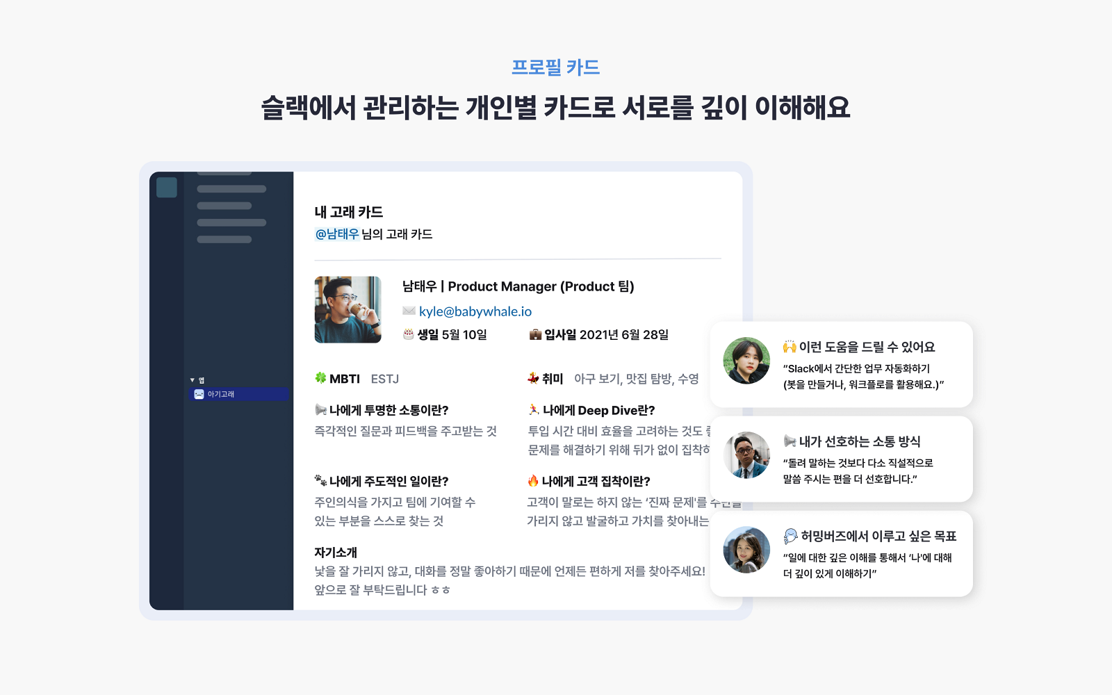 - 프로필 카드는 Slack에서 바로 사용하는 구성원 카드입니다. 회사마다 원하는 항목을 추가할 수 있어요.